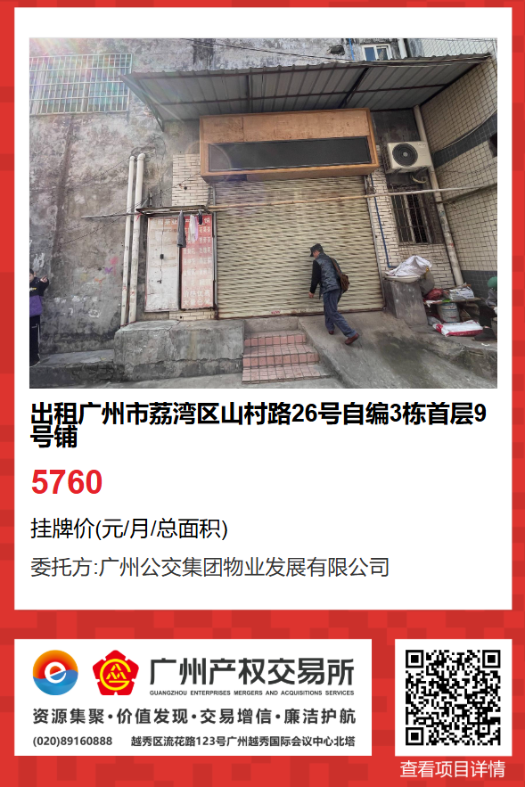 現(xiàn)有廣州市荔灣區(qū)山村路26號(hào)自編3棟首層9號(hào)鋪物業(yè)出租項(xiàng)目,該項(xiàng)目在廣州公有物業(yè)出租平臺(tái)網(wǎng)站自掛牌公開招租,歡迎有意向的企業(yè)法人或自然人(含個(gè)體工商戶)參加應(yīng)租?,F(xiàn)將有關(guān)事項(xiàng)說(shuō)明如下: